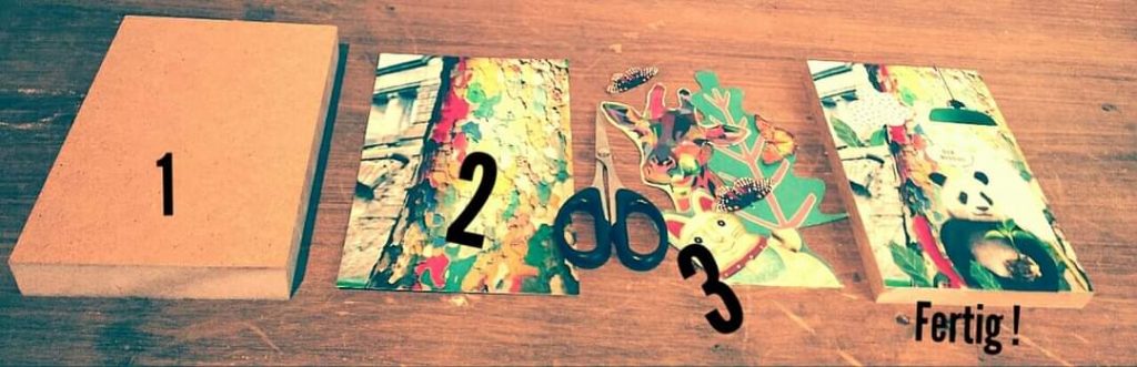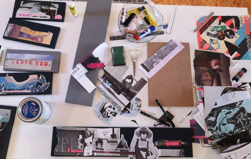 Hier siehst du wie sich eine Collage aufbaut. Meist ist ein eigenes Foto die Basis, das ich mit Ausschnitten aus einer Sammlung von Zeitschriften und Magazinen als Collage zusammensetze.